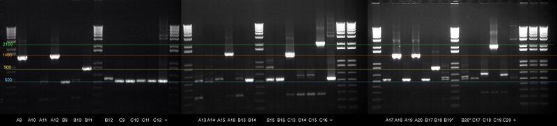 Result: two different streaks produced colonies for both #10 (KaiA) and #11 (KaiB). A colony PCR was started for 4 colonies of each streak. Noteto self: KaiA and KaiB labels switched on PCR and in LB cultures. Label A2.4 may have mixed lb culture.