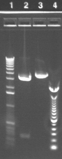 | Lane 4: P1 cut with NotI (2750, 919 bp expected) | |