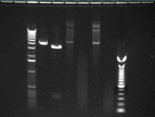 | Lane 7: P3 cut with NotI (should be 1831 and 919 bp)??? | |
