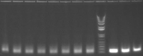 2KB ladder used. Clearly, none of the clones actually had a 2kb+ band, so mtrB was not incorporated.