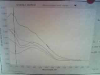 We wanted to pick the best stock, some samples seemed to have relatively high alcohol contamination so we observed the graph of the specs and for overlay control clicked Accumulate Until Clear to get a single graph with accumulated specs. A peak at ~220-230nm corresponded to possible alcohol contamination so based on the concentration and graph results GFP sample 4 seemed to be the best sample.