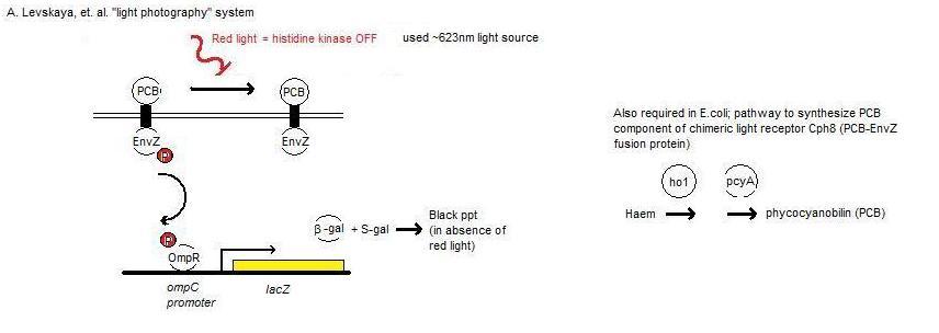 Below are schematics of the various light responsive genetic systems, including an attempt at adding an "inverter" component into the "Levskaya system".