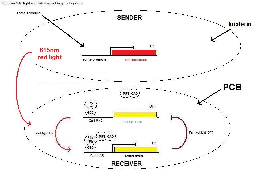 The potential problem for the yeast system is that phycocyanobilin (PCB) needs to be exogenously supplemented. It may need to be extracted from a suitable (algae?) source or the bacterial PCB biosyntheis pathway may need to be cloned into yeast, if possible. Also, if using yeast as a "sender" with red-luciferase, the luciferin substrate for luciferase also needs to be added externally. Uptake should occur if the media is made acidic.