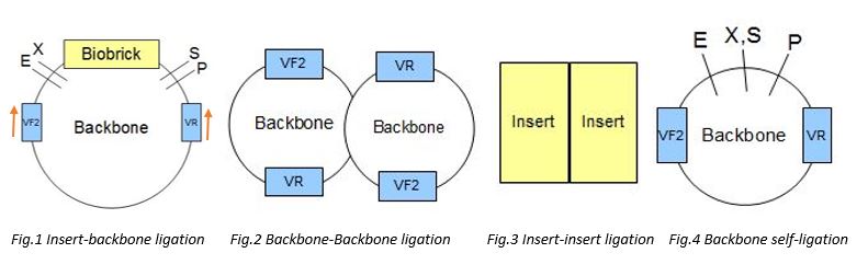For checking self ligation Primers of VR and VF2 were being used. The two primers would bind to the corresponding VR and VF2 binding sites on the backone, and amplify all the seqeunces in between the VR and VF2 sites. (Fig.1) There would be 4 possible outcomes, including backbone-backbone ligation (Fig.2), insert-insert liagtion (Fig.3), backbone self-ligation (Fig.4) and the insert-backbone ligation (Fig.1). First, for backbone-backbone ligation, as there are only 2 backbones ligate with each other without the insert, the VR and VF2 primers would only amplify the sequences of the biobrick prefix and suffx, as well as a few sequence in between the VR and VF2 sites, therefore, after gel elcectrophoresis, the expected band size would be around 300-400bp. Second, for insert-insert ligation, as the two inserts ligate with each other without the backbone, there would be no VR and VF2 sites and so, the primers would not bind to it and wouldnot have amplification. Therefore, after the gel electrophoresis, the expected band size would be 0bp. Third, for the backbone self ligation, as the backbone ligate with itself without the insert, the VR and VF2 primers would only amplify the sequences of the biobrick prefix and suffx, as well as a few sequence in between the VR and VF2 sites, therefore, after gel elcectrophoresis, the expected band size would be around 100-200bp. Forth, for backbone-insert ligation, after the gel electrophoresis, the expected band size would be around 2000bp.