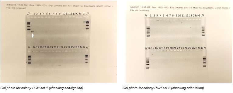 In the set 1 colony PCR gel photo, there is a band of size around 300-400bp resulted, it is suspected to be the backbone-backbone ligation outcome. In the set 2 colony PCR gel photo, no observable bands can be found.
