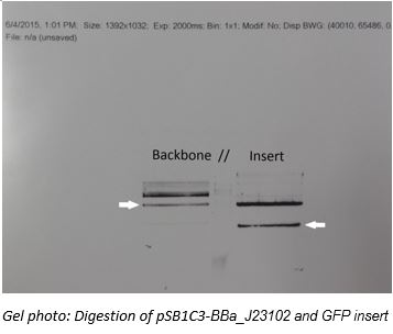 Identifying candidate colonies, people usually clone the constructs with reporters, so that colours can be observed from the colonies directly with bare eyes. However, this cannot show whether the orientations is correct or not. It has to be checked in molecular level. In this investigation, insert(GFP) and backbone were digested with the enzymes XbaI and SpeI, thus, the mRFP could be replaced by GFP but there would be five possible results due to different combinations of orders between the insert and backbone. In order to identify the correct one, colony PCR was used followed by gel electrophoresis.