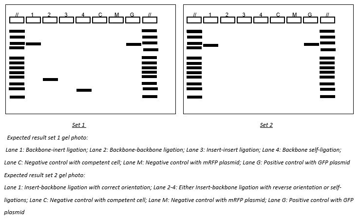 From the illustration of set 2, Lane 1 shows a band of size around 1300bp, which represents an outcome of backbone-insert ligation with correct orientation. For Lane 2 to 4, they do not show any bands, which represent outcomes of either backbone-insert ligation with reverse orientation or outcomes with self-ligation.