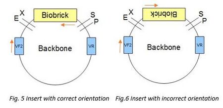 For checking orientation VF2 and the reverse primer of GFP were being used. VF2 primers would bind to the VF2 site on the backbone while the reverse primer will bind to the antisense of the GFP insert. The 2 primers would then amplify all the sequence between the insert and VF2 sites. There would be two possible outcomes, one with insert that is of correct orientation (Fig.5), another with insert of reverse orientation (Fig.6). First, for the product with insert of correct orientation, after gel electrophoresis, the expected band size would be around 1300bp. Second, for the product with insert of reverse orientation, as the two primers would not meet each other, as a result, there would be no amplification, therefore, after the gel electrophoresis, the expected band size would 0bp.