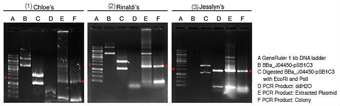 Figure 1. Analyzing PCR products on agarose gels. The polymerase chain reaction (PCR) was run using the colony and extracted plasmid of pSB1C3 - RFP coding device (pSB1C3 - BBa_J04450) and ddH2O for negative control. The PCR products were then resolved on 1% agarose gel along with GeneRuler 1kb ladder, template plasmid (pSB1C3 - BBa_J04450) and template plasmid digested with EcoRI and PstI, and post-stained with ethidium bromide. (1) Gel from Chloe. (2) Gel from Rinaldi. (3) Gel from Jesslyn.