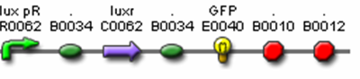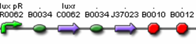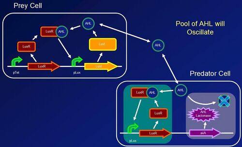 Predator-prey interactions form stable oscillations with frequencies which can be calculated precisely given certain assumptions. The team decided to model the biological oscillator on the basis of predator-prey interactions hoping that this novel approach would lead to success. Since one of the key assumptions to the model is the self dependent growth of prey, a positive feedback loop for the production of AHL was implemented in E. coli strain DH5a. Furthermore, a separate cell was constructed to sense the AHL molecules in the surrounding environment and respond by producing AiiA. This will result in the AHL being degraded, or in terms of the model, being “eaten by the predator”. Since AiiA production is dependent upon the concentration of AHL molecules, the action of AiiA itself, leading to a decrease in AHL concentration, would result in less AiiA being produced at a later time. The advantage of a two cell construct instead of previous one cell construct designs is that Paremeters can be changed easily by altering cell ratios. AHL is a suitable molecule to mimic the prey behavior. since it can be detected by a transcriptional regulator (LuxR) and therefore promote it's own growth. Also it easily diffuses outside of the cell as well having a complementary predator molecule AiiA. The team attempted to use as many parts from the Registry of Standard Biological Parts, which are outlined in the biological parts section. Once a stable oscillator has been created, several future applications into biological computing and synchronization become accessible.