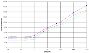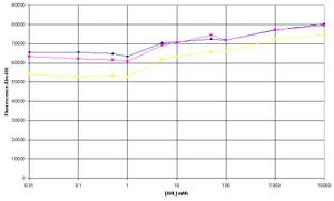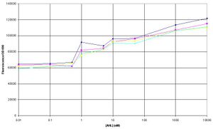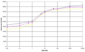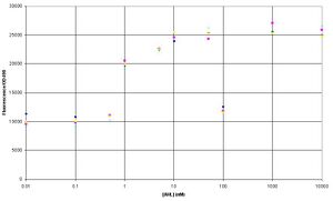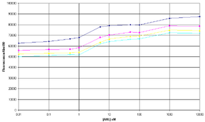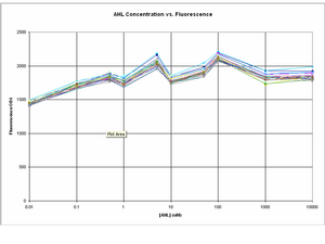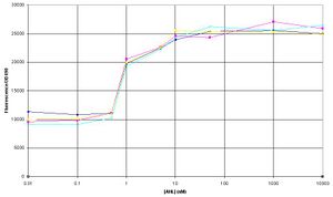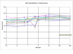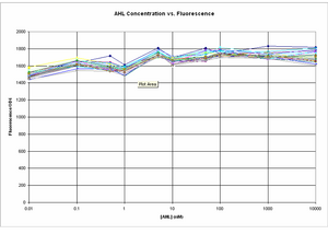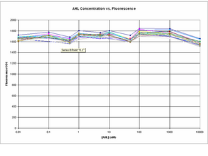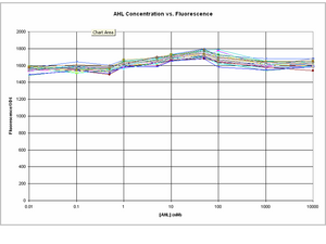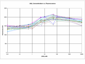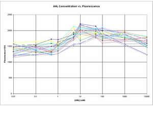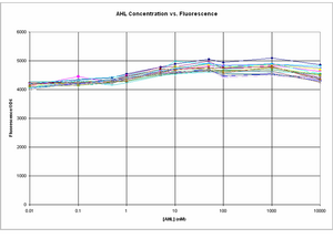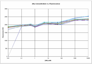 The amplitude of change between GFP expression at 0 AHL and 10uM AHL seems to a lot smaller in comparison to the experiment on 8/8/06.