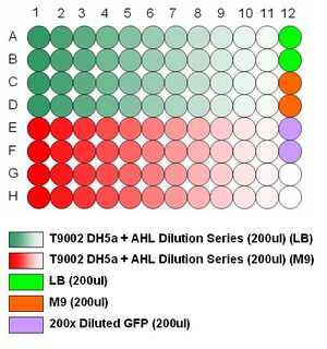 The results seem to suggest that the cultures in M9 would be responsive to greater concentrations of AHL than those tried, in contrast to the experiment on the 8th, and MIT's experiments