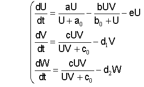 - Finally The model comprises dissipative terms of the model (eU,d1V,d2W) due to the washout in the chemostat.