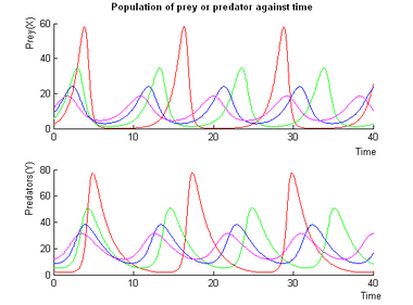 - The population of preys is controlled by the hunting carried out by the predators (the natural death rate of the prey is assumed negligible compared to the killing rate due to the predators). In the present case the population decay is proportional to the population of both preys and predators.