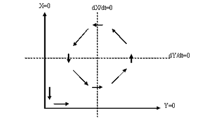 - After Jacobian analysis, it can be shown that the stationary point (0, 0) is a saddle point, while (d/c, a/b) is a centre (that is the vector field will rotate around the point without being attracted or repelled by it).