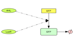 - [math]\displaystyle{ \frac{d[GFP]}{dt} = \frac{a \times [AHL]}{a_{0} + [AHL]} - d_{GFP} \times [GFP] }[/math]