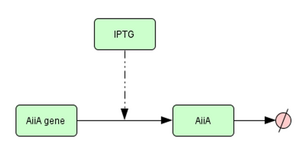Below you can see an image of the model that we used in CellDesigner to model the part. Following our assumptions and input/output, we have modelled IPTG activated transcription of AiiA from gene and subsequent degradation.