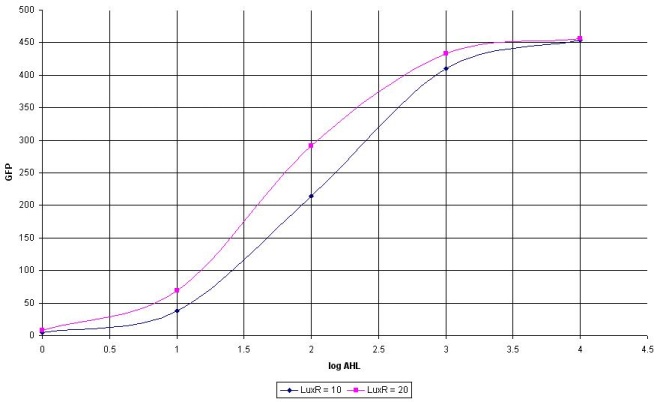 - How different AHL levels activate genes at a constant LuxR expression (The transfer function of pLuxR)