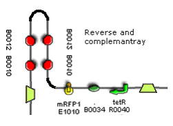 The Part also contains a RFP reporter which is transcribed in the 3’-5’ direction. This means that un-activated parts will fluoresce red and activated parts will not fluoresce. This allows you to see that the part is working in your system. It also allows you to observe the efficiency of activation of the part in your system. The part runs the other way to the rest of the system to prevent any fluorescence due to external Pops passing into the device