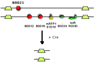- The Cre recombinase will also need a promoter - perhaps we could use one such as lacI? (we need to find out whether IPTG has any effect on other promoters though)