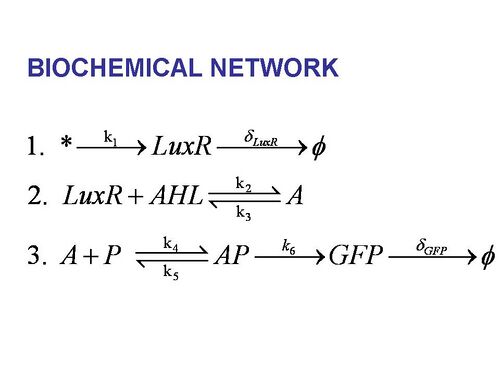 - [math]\displaystyle{ \frac{d[GFP]}{dt}=k_{6}\left[\frac{K_{\alpha}K_{\beta}[AHL][LuxR][P]_{0}}{1+K_{\alpha}K_{\beta}[AHL][LuxR]}\right]-\delta_{GFP}[GFP]\cdots\cdots(11) }[/math]