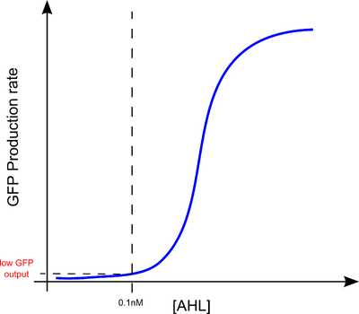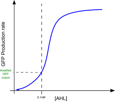 A possible application of the Hrp system is in the biofilm detector system. According to the specifications of the detector, the AHL levels processed will be around 0.1nM. Without the Hrp system, i.e. simply having a pLux promoter, only basal levels of expression of reporter will be achieved. With the amplification provided by the Hrp system (as demonstrated by Device 1 ) even this low input will provide high expression levels of the detector. This is illustrated in the graphs below.