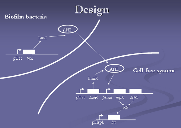 The Biofilm system focuses on detecting biofilm formation on medical equipment usually indicating the presence of a pathogenic organism. Therefore, apart from responding to low levels of AHL, the system must also have a fast response time otherwise its use will be fairly limited. This is another area that can be enhanced with the use of Hrp. Being based on sigma factor kinetics, it is much faster than the average biological component. Hence by inlcuding Hrp, we decrease significantly the repsonse time of our overall system. The way that this is incorporated in the design of the Biofilm system is shown below.