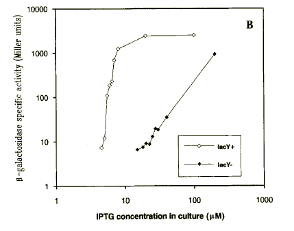 - Experiments have shown that by using IPTG and lacY- strains the population of induced cells can be made more homogeneous, diagram from the right taken from one of these studies.