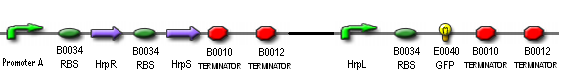 The promoter used to initiate expression of HrpR and HrpS will be pLux which is induced by adding AHL. By measuring the rate of acGFP expression upon addition of various concentrations of AHL we will find out the input characteristics of the pLux. The construct used to test the properties of the promoter (expression rate, response time) will be Hrp PromA image of which is shown on the left.