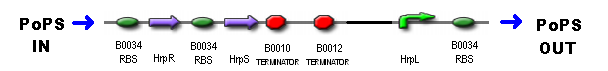 The final assembly (Hrp Dev1) that will be used to test our device is the one shown above. Since we cannot directly measure PoPS going in or out of the Hrp device, we had to seek of alternative methods of measuring the input/output. The promoter used to "start up" the device will be pLux for which we will know the input characteristics from measuring the acGFP production of the promoter test assembly. The output will be measured by recording the rate of fluorescence production (acGFP) of the assembly below. Therefore, by the end of the day we will have both the input and output characteristics in terms of the rate of acGFP production.