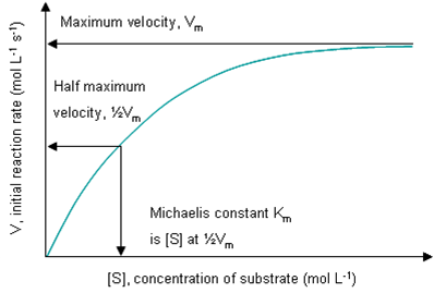 Km is (k2+k3) / k1 = [E][S] / [ES], i.e. Km is the Keq for the non-productive dissociation of the ES complex back to E and S. A low Km indicates the enzyme has a high affinity for its substrate. Therefore efficient enymes have lower Km. Km is a constant: it equals [S] at ½Vm, and is measured in mol L-1, or more usually mM.