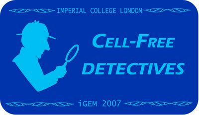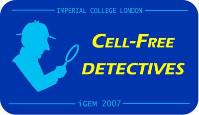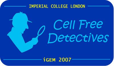Cheuk Ka Tong 00:31, 28 September 2007 (EDT): Hey all, hope you like this logo for our T-shirts. The design is simple but meaningful. Sherlock Holmes represents the "investigative" nature of our project - detecting the presence of bacteria in hospitals, and tracking the thermal exposure of food. The novelty of our project is the use of cell-free systems. The back of our T-shirts read "Imperial College iGEM 2007 Team". An all-black logo may reduce the cost of printing the T-shirts and is compatible with a variety of background colours as well (personally I like the bright orange colour). Please feel free to give your feedback so I can improve on it.
