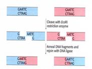The vector is prepared for accepting a new DNA fragment by cleaving it at a single specific site with a restriction enzyme. The DNA fragment of interest is prepared from a larger piece of DNA using the same restriction enzyme as was used to open the plasmid DNA. The single-stranded ends of the fragment are then complementary to those of the cut plasmid. The DNA fragment and the cut plasmid are annealed and then joined by DNA ligase. DNA ligase catalyzes the formation of a phosphodiester bond at a break in a DNA chain. An energy source such as ATP is required for the joining reaction.