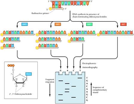 The basis of the dideoxy method is to use single strands of the DNA sample to be sequenced as a template for complementary strand synthesis. In addition to deoxyribonucleotides the four types of dideoxyribonucleotides are included in the reaction. These are randomly incorporated into synthesizing strands and so will randomly terminate DNA synthesis. If enough DNA synthesis reactions are carried out, random incorporation will mean that at some point a dideoxyribonucleotide will be found for every nucleotide in the sequence will be found at the end of a terminated strands. These randomly terminated strands are then separated with gel electrophoresis. If we know which dideoxyribonucleotide was incorporated into a strand then we can work out the sequence nucleotide at a time.