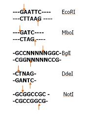 - Sticky ends where one of the stands of DNA is longer and so overhangs the other. This type of end occurs when the cleavage sites on both strands are not opposite each other. The examples shown in the diagram produce this types of end.