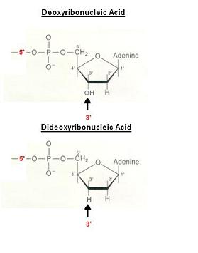 The dideoxy method relies upon dideoxyribonucleic acids, these nucleic acids lack the hydroxyl groups at the 3’ position that are found on deoxyribonucleic acids (see diagram). In DNA synthesis, the addition of a dideoxyribonucleotide to a growing strand will cause termination of the synthesis because there is no 3’ hydroxyl group to allow a phosphodiester bond to form.