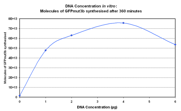 Figure 1.1 and figure 1.2 show that molecules of GFPmut3b increase with increasing DNA in our in vitro chassis. However, after 2µg the difference in molecules of GFP produced becomes very small and when the standard dievation is taken into account the differences looks like it is negligible.
