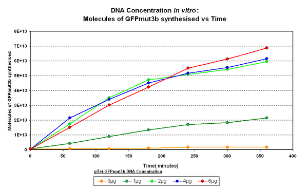 When the results for this experiment are compared to a similar experiment carried out for [[PUT LINK IN HERE TO DNA CONC pTet-LuxR-pLux-GFPmut3b] the difference in optimum DNA concentration becomes apparent. The pTet-LuxR-pLux-GFPmut3b showed an optimum at 4µg, above which the output of GFP molecules decreases. This is not the case for pTet-GFPmut3b which although does not see an increase above 4µg, it does not show the decrease.