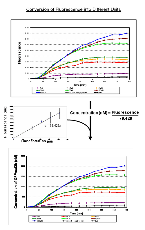 Using our calibration cuvre of GFPmut3b in our in vitro chassis we are able to convert the fluorescence units into a number of different units. We have looked at how we can convert between four different units: