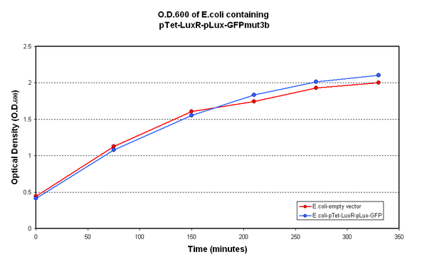 The O.D.600 shows that the growth of the cells containing the empty vector and pTet-LuxR-pLux-GFPmut3b were in the exponential growth phase that appeared to be moving into the steady state phase at the end of the experiment. There is no clear difference between the empty vector or the vector containing pTet-LuxR-pLux-GFPmut3b, this means that the pTet-LuxR-pLux-GFPmut3b appears to have very little metabolic burden on the cells.