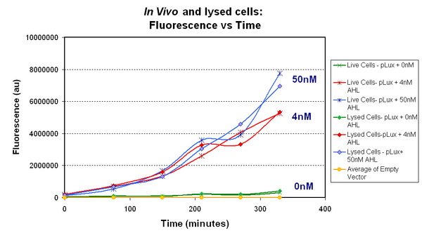 Figure 1.1 shows that the construct pTet-LuxR-pLux-GFPmut3b works in vivo. The results show that with increasing [AHL] the fluorescence increases, therefore the GFPmut3b produced is increasing with increasing [AHL]. The negative control increases slightly, however remains very low in comparison to the samples.