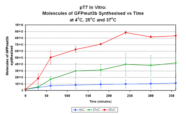 Figure 1. shows us that the pT7-GFPmut3b synthesizes over time for all the temperatures tested. When the three temperatures are compared it is clear that 4°C is the minimum temperature for expression and that 25°C is the maxiumum. Interestingly 37°C is not the maximum for pT7 in vitro, with 25°C producing almost double the molecules of GFPmut3b at 37°C.