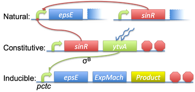 - Light present: Inducible promoter is activated, meaning product is transcribed along with EpsE. Native EpsE is still repressed by the native and synthetic constitutive SinR, but the synthetic EpsE should engage the clutch and halt the bacteria in a short timeframe. The bacteria should, therefore, stop and start producing product.