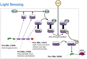 Within the AppA system the effect of light on gene expression is mediated through the repressor PpsR4. From the diagram it can be seen that the system is only light sensitive in anaerobic conditions, in these conditions exposure to UV (blue light) causes the disassociation of PpsR4 from AppA and allow the PpsR4 to bind DNA and cause repression. [5]. But when this Rhodobacter system has been reconstructed exogenously in E.coli the system fails to respond to blue light [6]