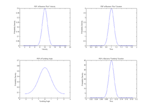 % Distribution of tumbling-time ts=[0:0.001:0.2]; %Range of tumbling duration ts_avg=0.1; %Average tumbling duration ts_dev=ts_avg/10; %Standard Deviation sigma-s y4=normpdf(ts,ts_avg,ts_dev); %Gernation of PDF of tumbling duration subplot(2,2,4); plot(ts,y4); title('PDF of Bacteria "Tumbling" Duration') xlabel('Time'); ylabel('Probability Density');