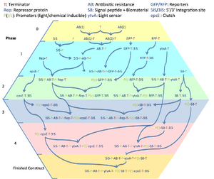Without the sequences we ordered from Geneart, we can make a start by using the parts acquired from the Registry. These experiments are thus termed Phase 0. Phase 1 requires some of our  Geneart sequences - most notably the promoters/RBSs - and is focused on characterisation of the constitutive promoters. Phases 2 and 3 involve construction of test constructs to characterise our inducible promoters (which will lead our epsE and biomaterial genes). Phase 4 looks at light-inducible promoters.