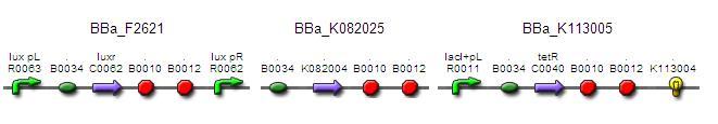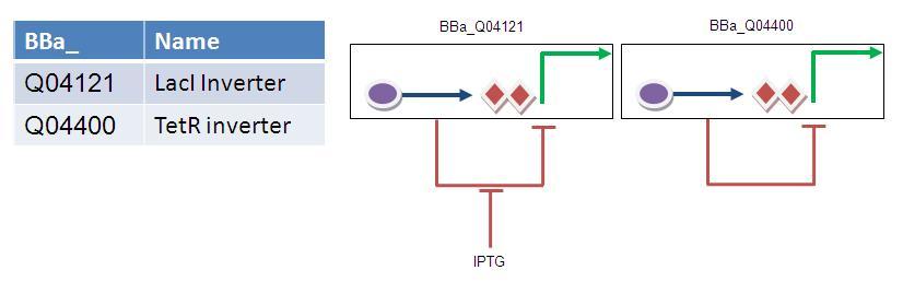 Note, I have not been able to find these parts fused together as Biobricks - therefore assembly would require 3 ligation steps (unlike the double inverter timer which only requires 1 ligation step).