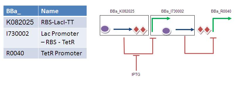 Overview: This timer works on a double repression mechanism. Varying IPTG concentration provides a variable threshold which must be overcome by the accumulation of LacI for the switch to flip. The production of LacI will ultimately be linked to the accumulation of protein.