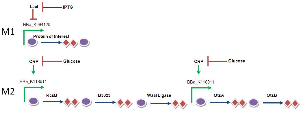 In the timer outlined below, M2 is triggered when the glucose in the medium runs out. M1 is selectivly triggered via the addition of IPTG, before which endogenously expressed LacI blocks expression of M1.