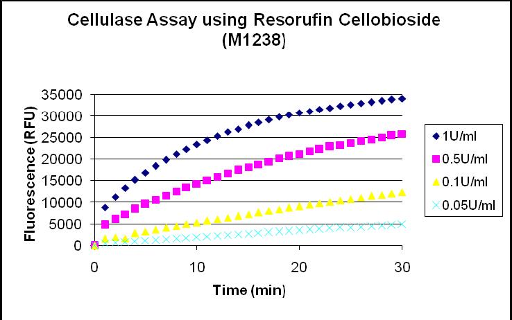 Activity of most cellulases is monitored by the fluorescent substrate, Resorufin Cellobioside, contained in the kit. Upon cleavage, the fluorescent compound, Resorufin, is released and fluorescent activity measurements can be taken. The Fluorescent Cellulase Assay Kit allows fast and easy detection of most cellulases in a microtiter plate based assay format.